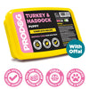 Our turkey raw puppy food with white fish is an excellent source of Omega 3 fatty acids which promote a healthy immune system and great coat and skin condition. Turkey is a lean white muscle-building meat, a highly digestible source of protein, low in saturated fats. The perfect combination to support growth and development of growing puppies