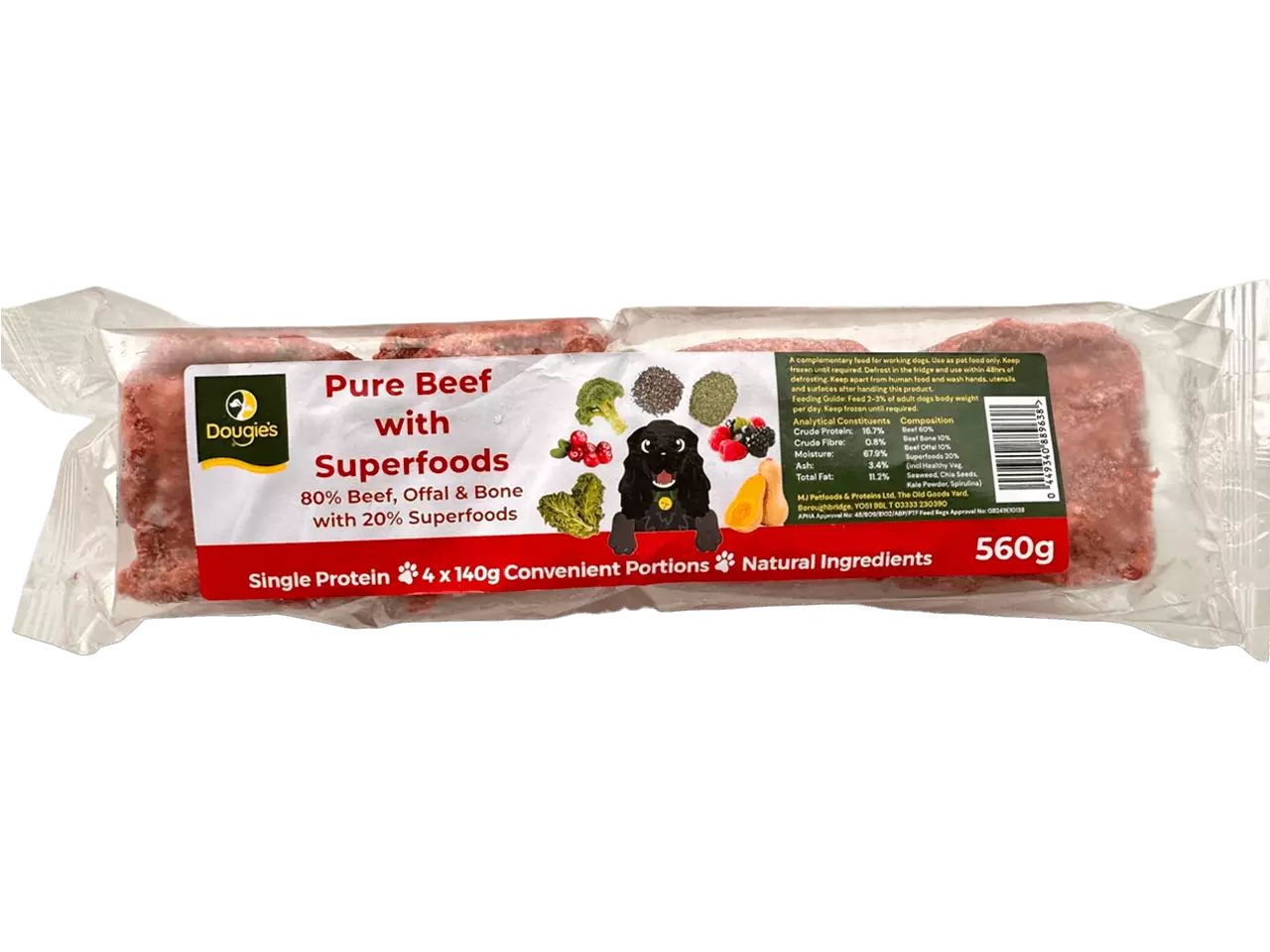 60% Beef, 10% Beef Bone, 10% Beef Offal, 20% Superfoods (incl Healthy Veg, Seaweed, Chia Seeds, Kale Powder, Spirulina) Complimentary Feed for Working Dogs