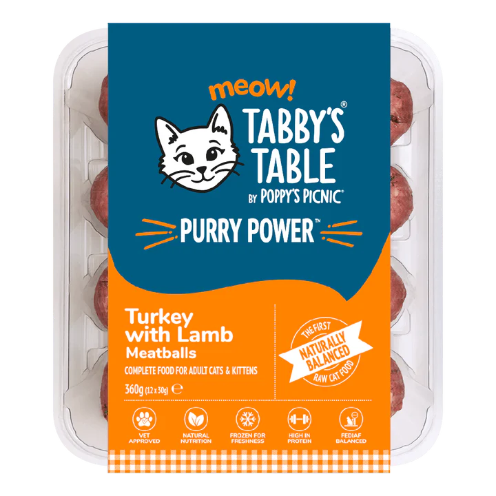 Tabby’s Table PURRY POWER Turkey with Lamb - the first raw meatballs for cats. Made with free range turkey, grass fed lamb, ground bone, heart, offal and some tasty extras.